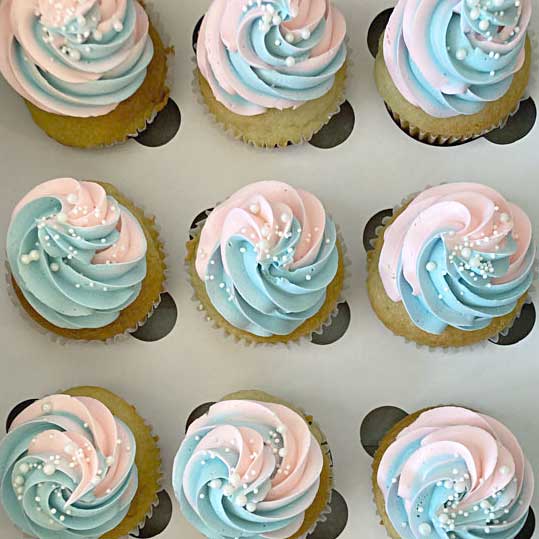 Cupcake: Vanilla cake with pink or light blue vanilla buttercream filling